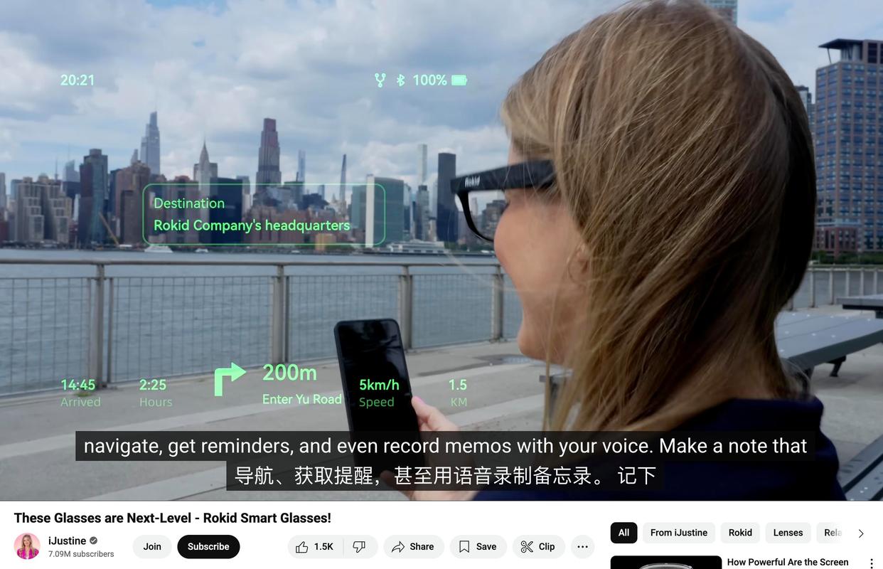 其次,在场景融入度上,智能眼镜正在全面接管手机的高频核心场景。比如当你需要导航时,箭头和路线直接叠加在真实道路上,无需低头看手机,使驾驶更安全;当你与外国人交流,实时翻译字幕就浮现在对方肩头,消除了举着手机递来递去的尴尬;工作中,还能化身“脱稿神器”,无论是上台发言或是汇报都让你从容自信。